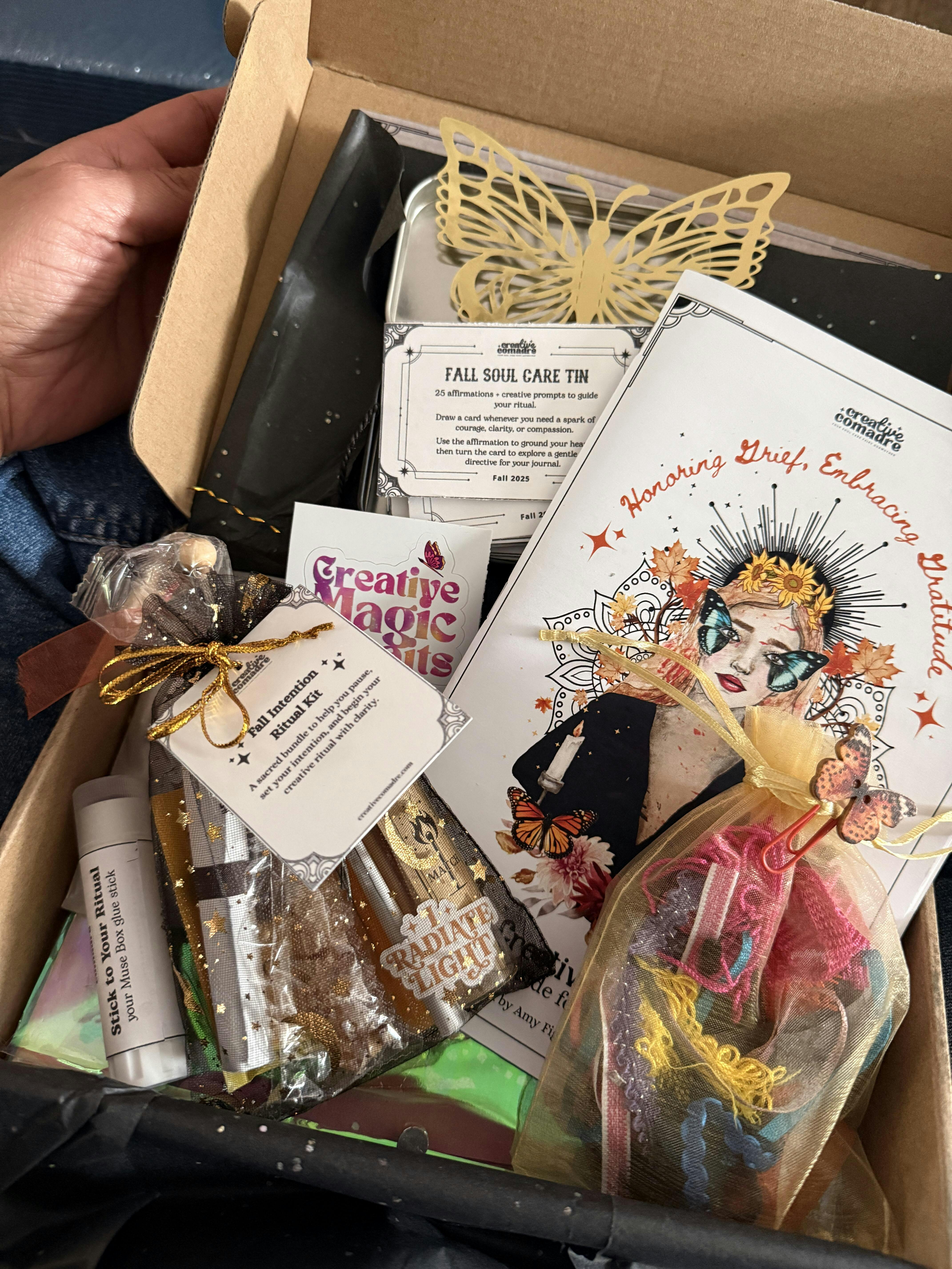 Just opening the box felt like Fall!! The cinnamon scent that slipped out so happily, as if saying, Hey Comadre!!, was such a beautiful welcome🫶🏽!! I look forward to exploring all that is this Fall Muse Box. I can’t believe all that comes with this box.. the tin box, Amy’s art 😭, all the goodness in between, definitely a treasure I’m excited to embrace !!